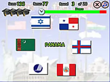 20秒以内に正しい答えを選んでください。10秒以内に正解を選ぶことができれば、ボーナスを獲得できます!マウスの左ボタンをクリックして答えを選びます。質問形式は2種類あります。正しい国旗名が中央に示され、6つの国旗の中から正解を選ぶものと、国旗が表示され、6つの選択肢の中から国名を選ぶものです。